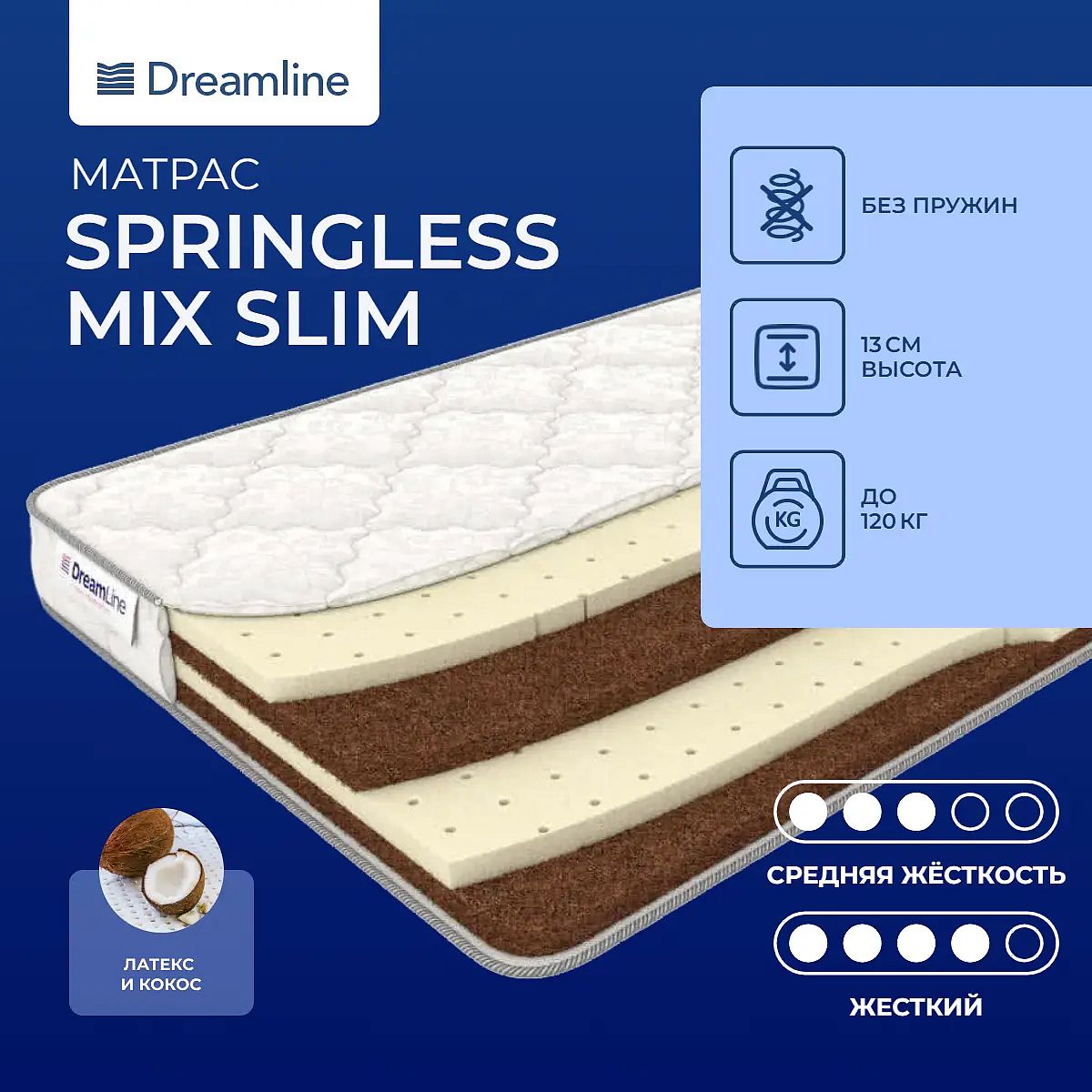 Натуральные материалы в основеДвусторонняя модель, не имеющая пружинной основы, выполнена из попеременно уложенных слоев кокосовой койры и натурального латекса.Оба эти материала относятся к природным наполнителям. Они гипоаллергенные и абсолютно безопасны для здоровья и сна человека. Одна сторона – упругий латексС одной стороны модель представлена слоем натурального латекса. Это материал, обладающий способностью подстраиваться под все изгибы тела спящего и превращать его сон в сказку. К тому же, латекс отлично вентилируется, пропускает воздух внутрь, а значит, изделие «дышит».Вторая сторона – жесткий кокосДругая сторона выполнена из кокоса – материала, обладающего повышенной жесткостью и достаточными показателями по воздухопроводимости. Кроме того, кокос способен прослужить достаточно долгий срок.Чехол из мягкого жаккардаЧехол изделия выполнен из мягкого хлопкового жаккарда, который имеет стежку на холлконе.Защита матрасаДля защиты поверхности матраса от преждевременного износа рекомендуем дополнительно приобрести защитный или водонепроницаемый наматрасник. Он сделает поверхность чистой и свежей надолго.Другие моделиМодель имеет среднюю жесткость с одной стороны и умеренно-жесткую - с другой. Если вас больше интересует модель помягче, то посмотрите матрас Dreamline Mix Hol.