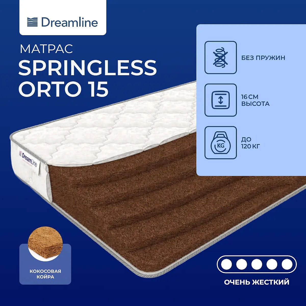 Толстый матрас из кокосовых слоевЖесткая беспружинная модель, состоящая из 5 попеременно уложенных слоев кокосовой койры (3 см).Этот матрас отлично подойдет для людей с заболеваниями опорно-двигательного аппарата, а также для любителей жестких поверхностей. Кокос – полностью гипоаллергенный материал, поэтому он рекомендован для аллергиков и новорожденных. Комфортный чехолПоверхность матраса мягкая, выполнена из комфортного жаккарда, простеганного на холлконе.Защита матрасаДля защиты поверхности матраса рекомендуем докупить защитный наматрасник. С его помощью возможно увеличить эксплуатационный срок всего изделия.Другие моделиМодель подойдет для людей, предпочитающих высокие и жесткие матрасы. Если вы хотите матрас помягче, то рекомендуем посмотреть модель Dreamline Soft. А если вам нужен жесткий матрас меньшей толщины, то обратите внимание на Dreamline Orto 9.