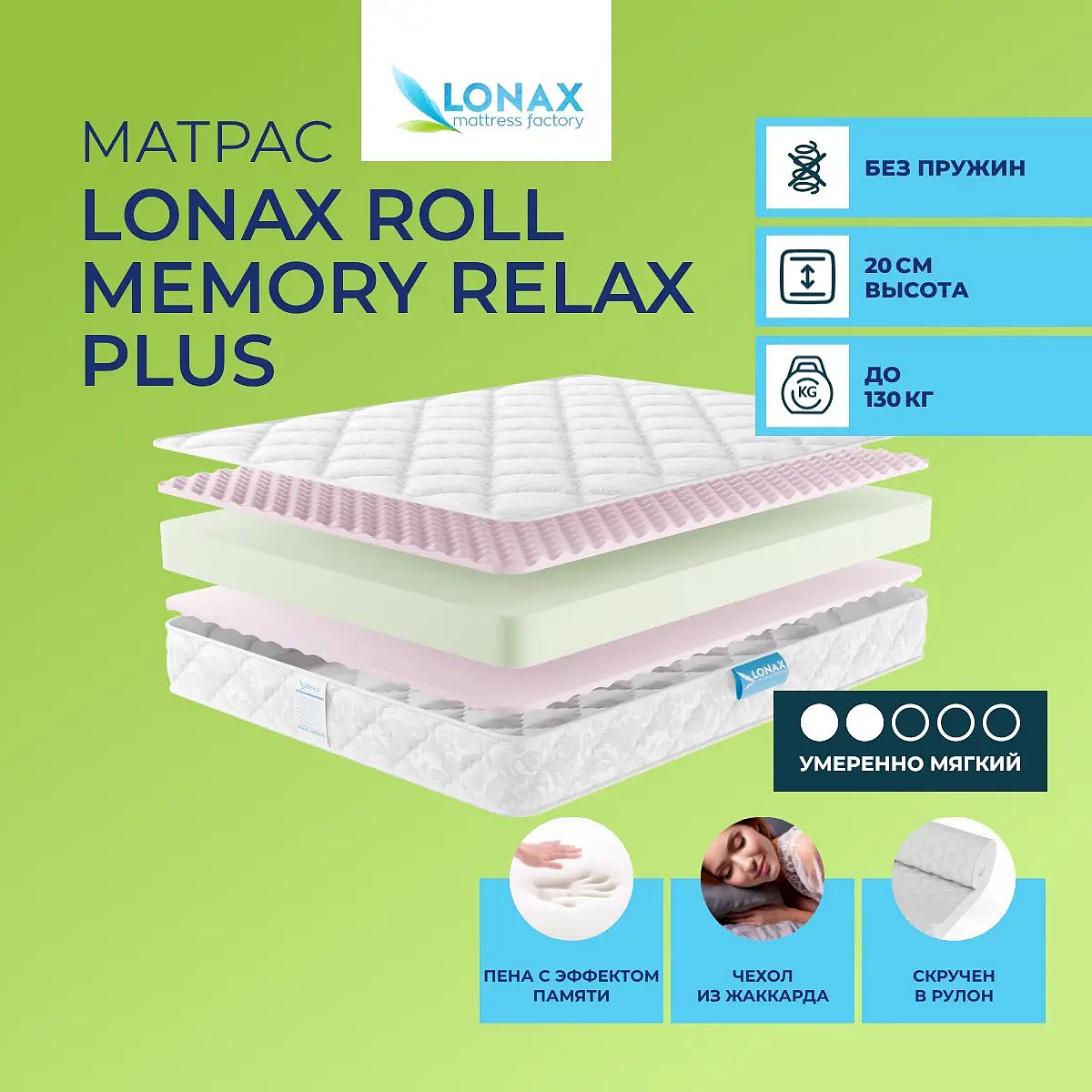 Средне-мягкий матрас «Lonax Roll Memory Relax Plus» просто создан для истинного ценителя комфорта. Такой вариант хорошо подойдет людям с небольшим весом.