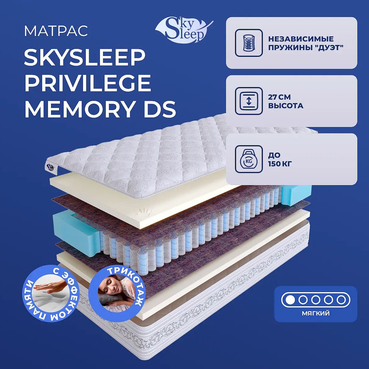 Премиальный матрас SkySleep Privilege Memory DS создан для тех, кто ценит мягкость, технологичность и продуманный комфорт в спальне. Благодаря инновационному сочетанию пены с эффектом памяти и независимых пружин «Дуэт», матрас обеспечивает деликатную поддержку тела и глубокое расслабление. Высота конструкции — 27 см — подчёркивает ощущение уюта и уместна как для современных, так и для классических интерьеров. Мягкая поверхность из мемориформ (по 4 см с каждой стороны) подстраивается под контуры тела, равномерно распределяет давление и способствует восстановлению мышц во время сна. Трикотажный чехол с простёжкой на шерстипоне дарит приятные тактильные ощущения и сохраняет тепло, а блок пружин DS рассчитан на нагрузку до 150 кг на спальное место, что гарантирует долговечность и устойчивость к износу. Ключевые особенности